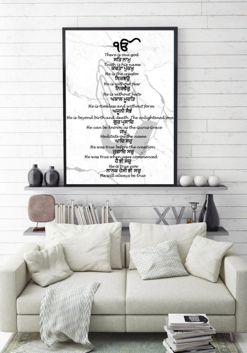Modern and eye catching Mool Mantar in Gurmukhi (with translation) which has a meaning ‘essential teaching.’